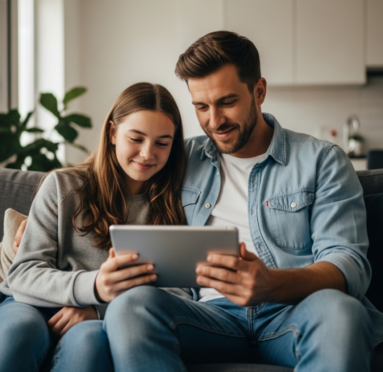 Patient schaut zu Hause oder in der Praxis-Wartezeit
